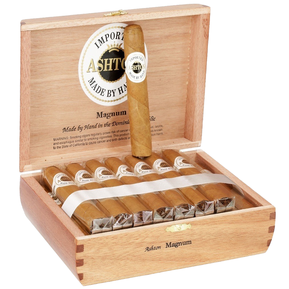 The Ashton Classic Magnum is a premium cigar renowned for its smooth, mild-to-medium-bodied profile and exceptional craftsmanship. Measuring 5 inches in length with a 50-ring gauge, this Robusto-shaped cigar features a Connecticut Shade wrapper over aged Dominican binder and filler tobaccos. The result is a creamy, complex smoke with notes of cedar, cashew, coffee bean, and almond, complemented by a touch of spice.