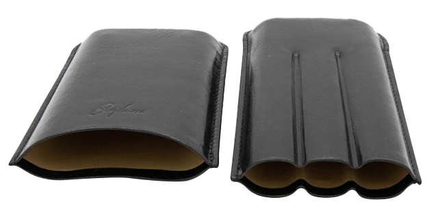A sleek black leather 3-finger cigar case by Brigham, designed to hold and protect up to three Toro-sized cigars. Durable, compact, and perfect for travel or everyday carry.