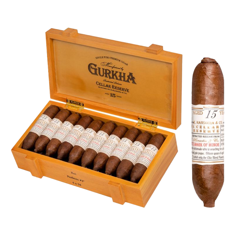 The Gurkha Cellar Reserve 15 YR KOI – Perfecto (4″ x 58) is a medium to full-bodied cigar that features a rare and exceptional blend. It is wrapped in an aged 15-year-old Colorado wrapper and filled with a combination of Dominican and Nicaraguan long-fillers, offering a rich and complex flavor profile. The cigar delivers a smooth, balanced smoke with notes of cedar, earth, cocoa, leather, and a hint of spice. The Perfecto shape allows for a unique smoking experience, providing a cool, even burn while evolving in flavor as you smoke. The Gurkha Cellar Reserve KOI is known for its exceptional craftsmanship, making it a premium choice for seasoned cigar enthusiasts who enjoy depth and complexity in their smoke.